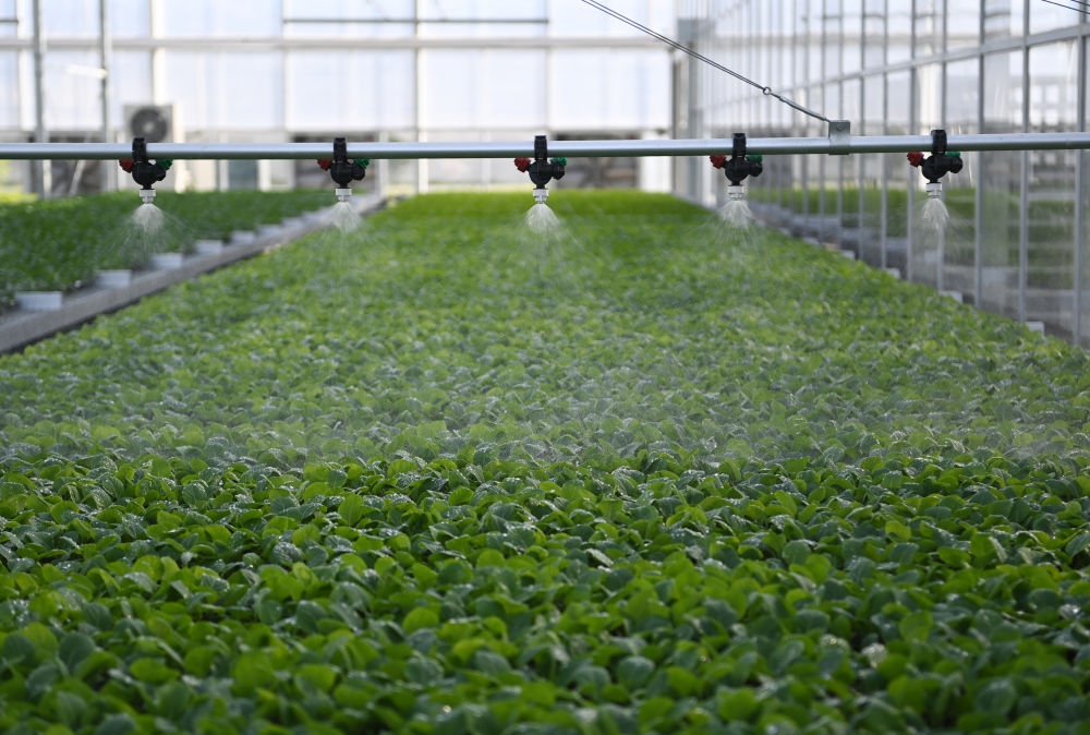 在数字种苗工厂,意大利进口播种机飞速完成针眼大的种子插播,播种速度可达每小时12万粒;催芽室内白雾缭绕,湿度可达95%,室内催芽一般只需4-5天,相比自然催芽快3倍;育苗车间全自动喷水机正在喷灌,花草苗如期生长……